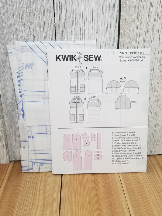 Kwik Sew K3975 Childs Quilted Vest Detachable Hood XS S M L XL Uncut FF