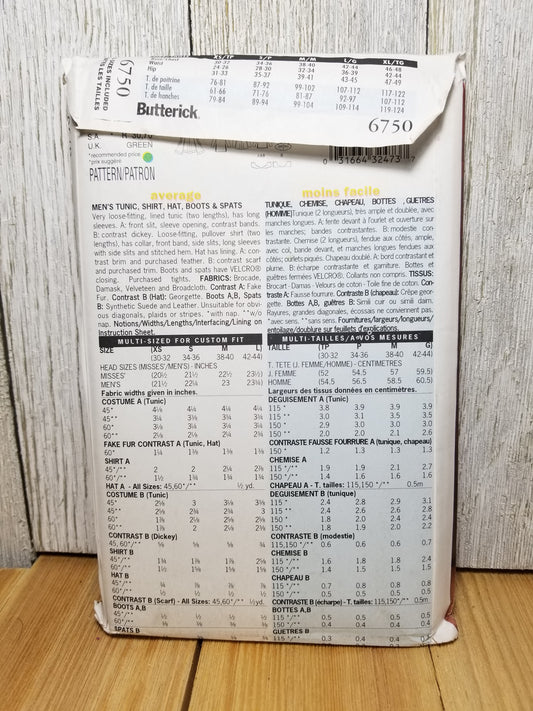 Butterick 6750 Renaissance Medieval Men's Tudor Tunic Shirt Hat Boot Spats Size 30-44 Uncut FF