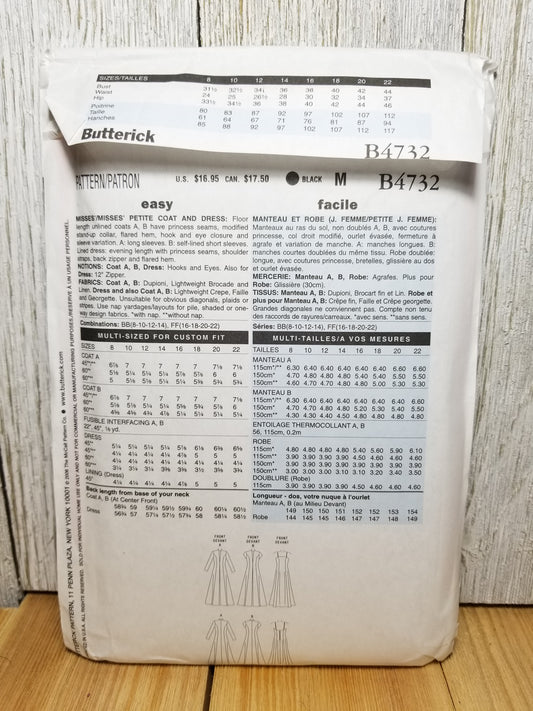 Butterick B4732 sewing pattern Miss/Miss Petite Size BB 8-14 Coat and Dress Floor Length Uncut FF