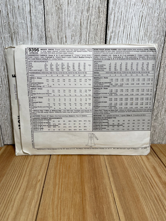 McCall's 9396 Empire Wasit Square Neckline Dress Size 8-12 Pattern Uncut FF