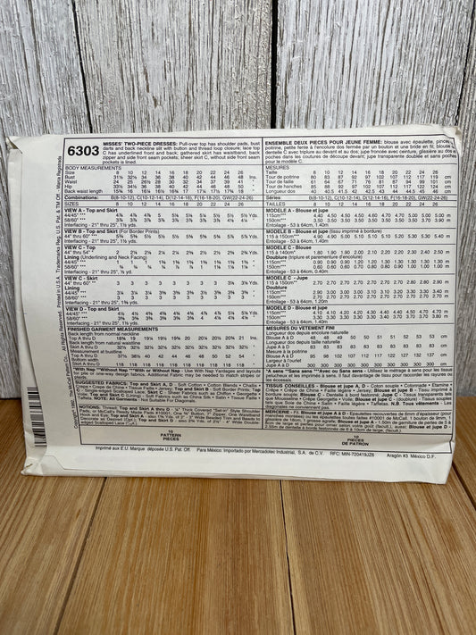 McCall's 6303 Two Pices Dress Pull Over Top with Shoulder Pads Gathered Skirt Size 10-14 Pattern Uncut FF