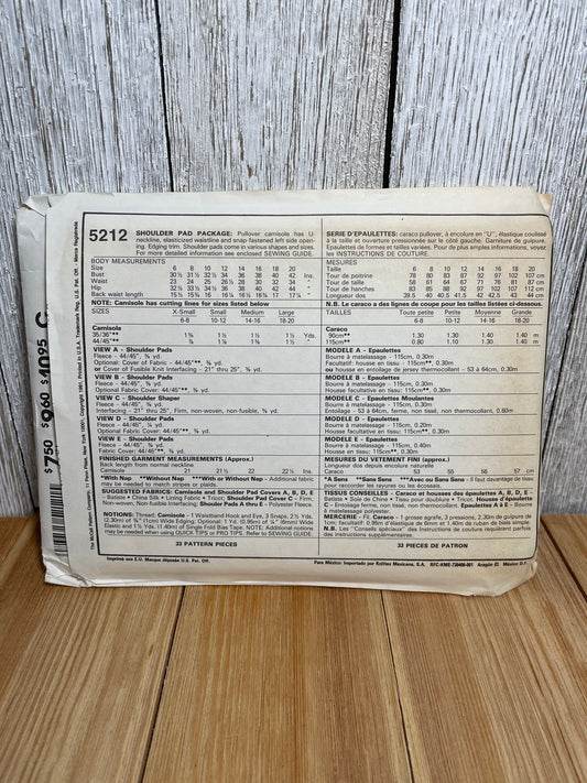 McCall's 5212 Shoulder Pad Package Plus Two Camisoles Size 6-20 Pattern Uncut FF