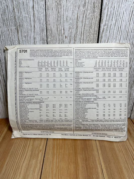McCall's 5701 Large Yoke Lose Fit Sleepwear Dress Shirt Pants and Boots Size 6-8 Pattern Uncut FF