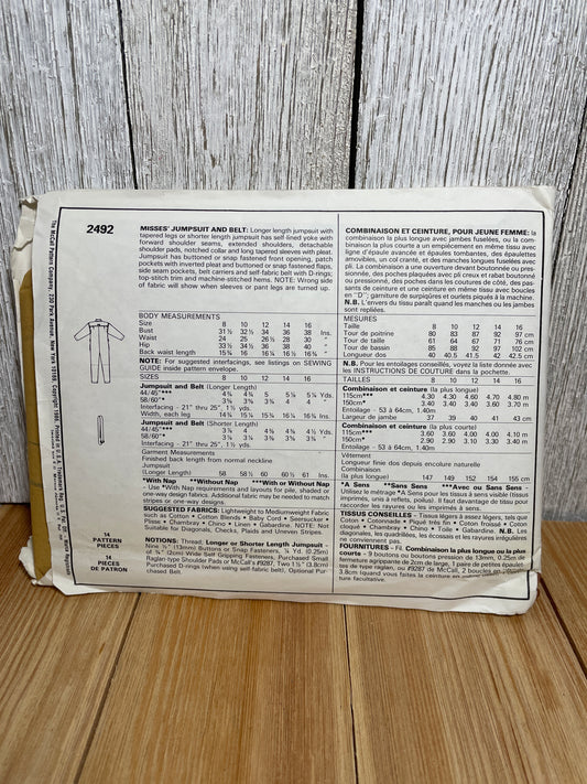 McCall's 2492 Jumpsuit with Pockets and Belt Size 8 Pattern Uncut FF