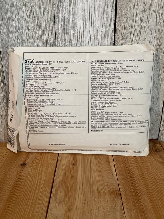 McCalls Crafts 3760 Country Rabbits Stuffed Bunny 20" Pattern UNCUT FF