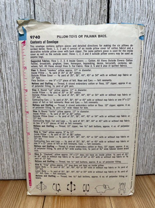 Simplicity 9740 Vintage Pillow Toys Turtle, Monkey, Elephant, Frog, Owl, Cat Pattern UNCUT FF