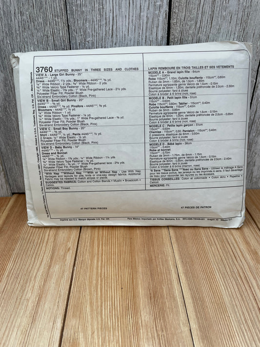 McCalls Crafts 3760 Stuffed Bunny 20" Pattern UNCUT FF