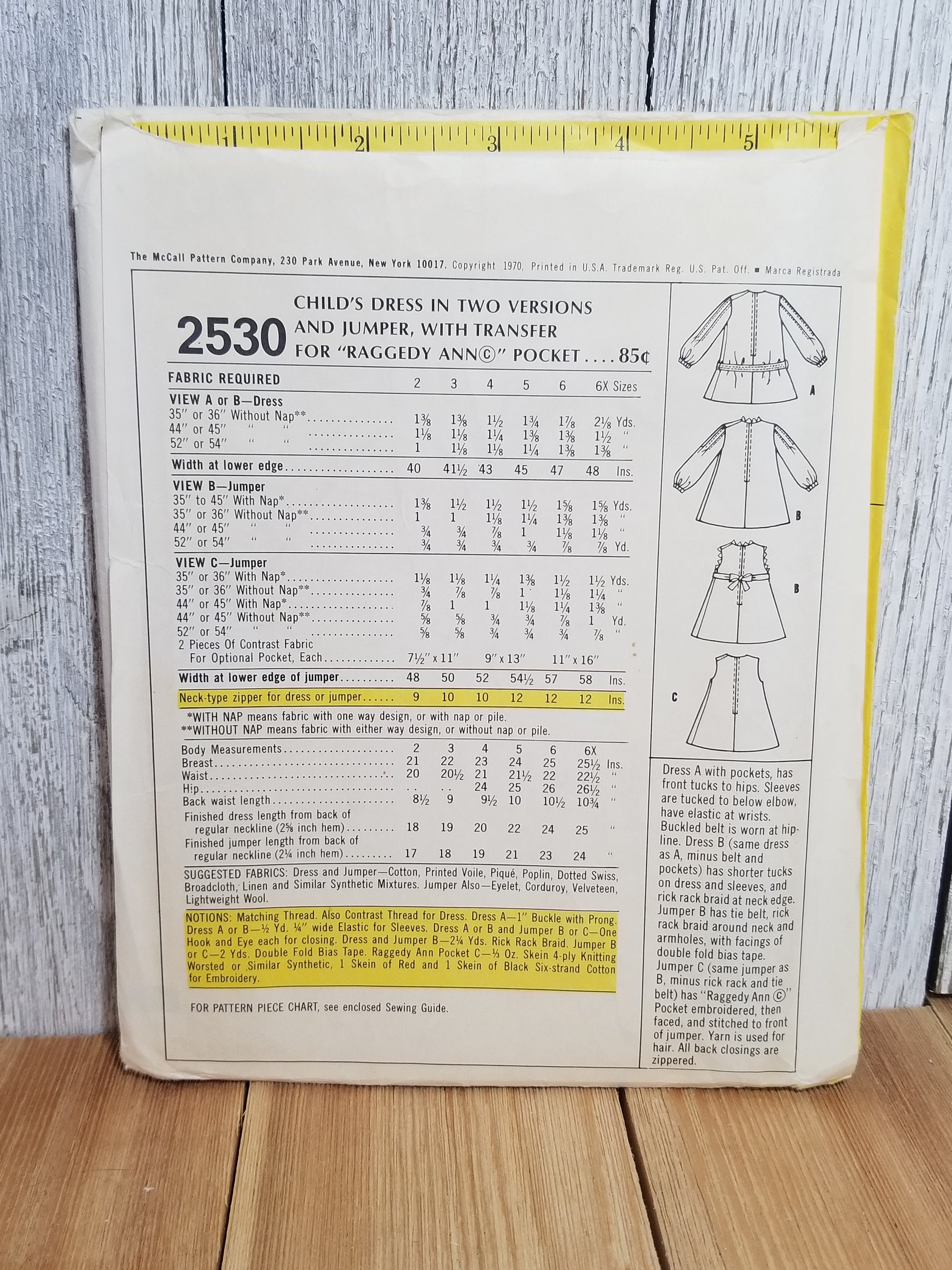 1970 McCall's 2530 Tuck Front Dress and Pinafore Size 4 Uncut FF Sewing Pattern Raggedy Ann
