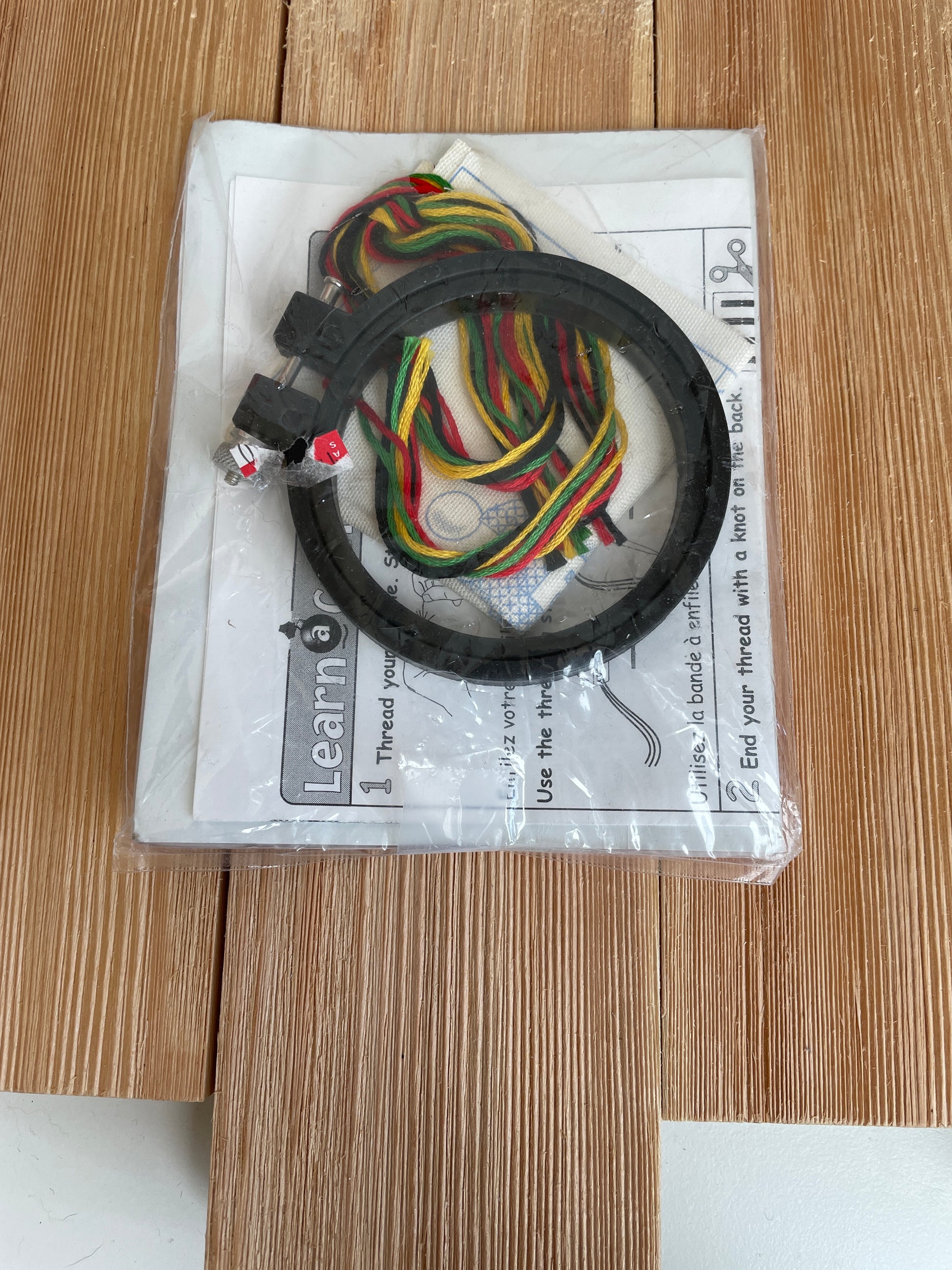Comes with cotton thread, printed white sailcloth, 3" plastic hoop, needle and instructions