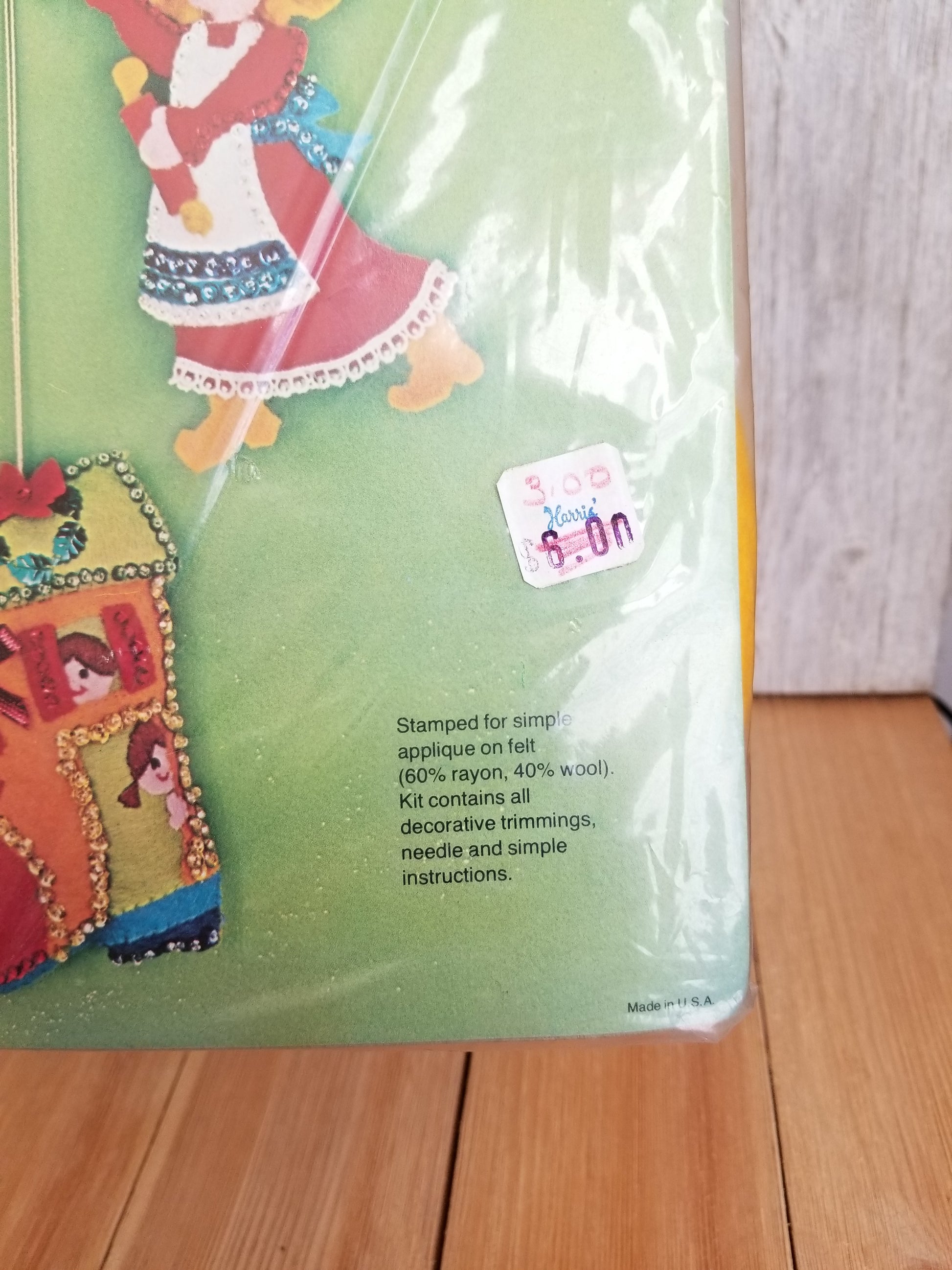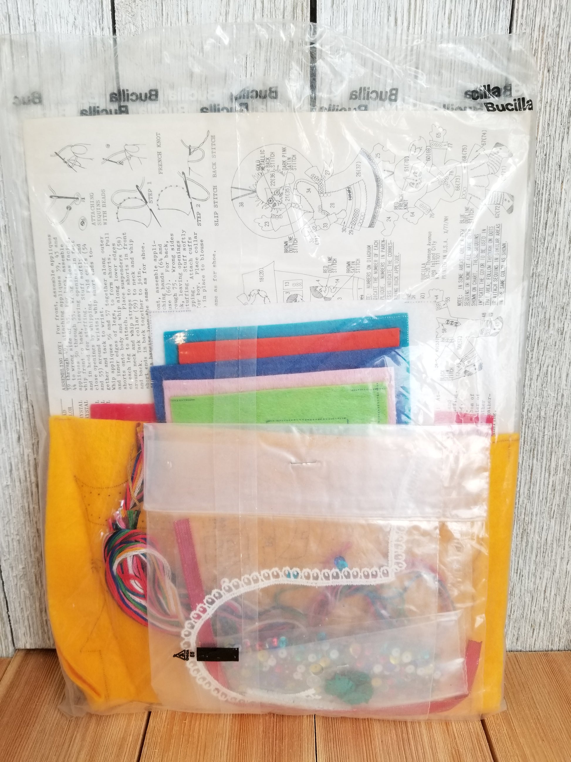 open but appears complete. includes: Felt in various colors, Beads and sequins, gold string, floss, pattern and instructions. in original packaging