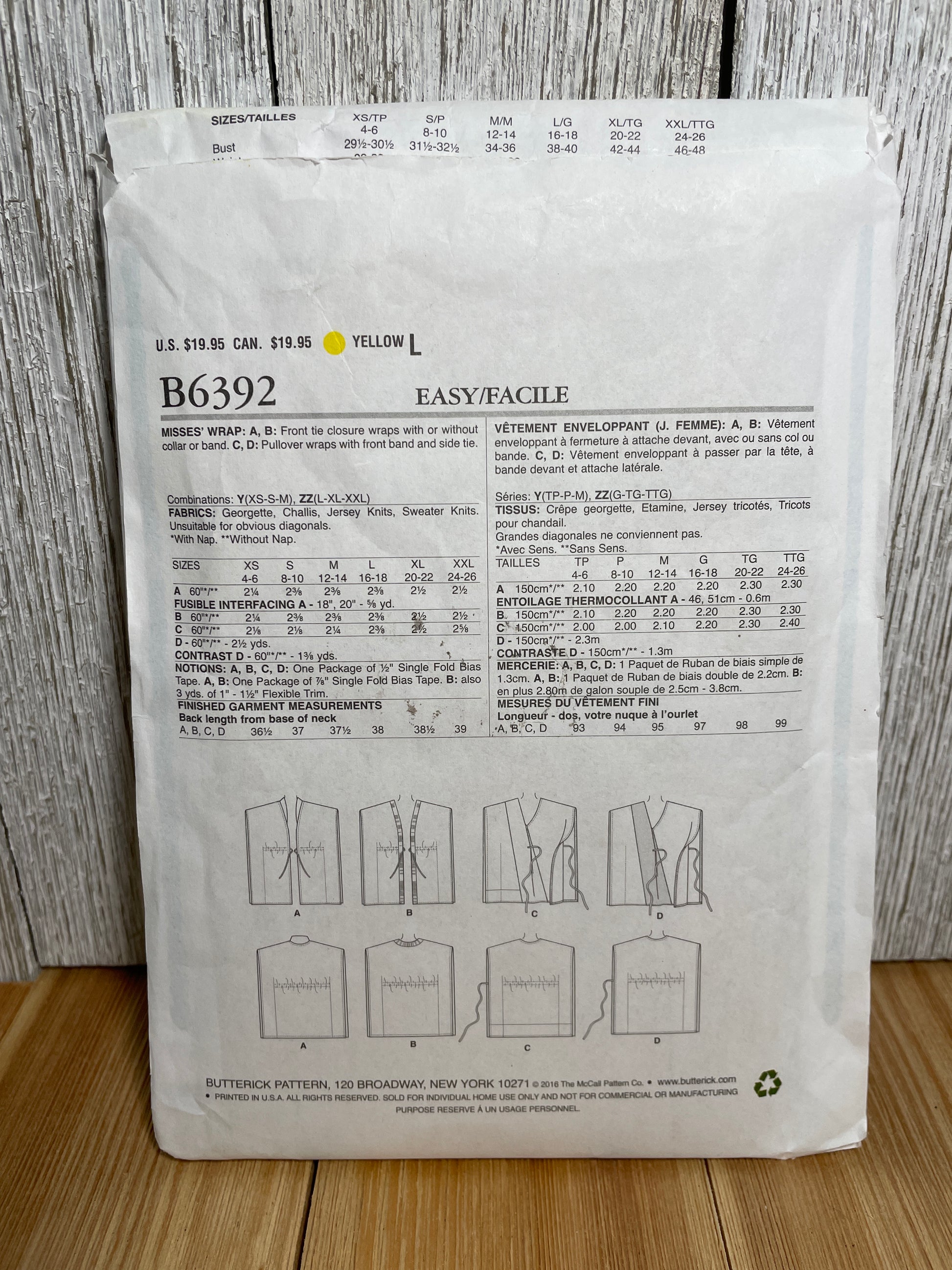 Butterick B6392 (6392) Misses Wrap in 4 Styles Size XSM-MED Pattern Uncut FF