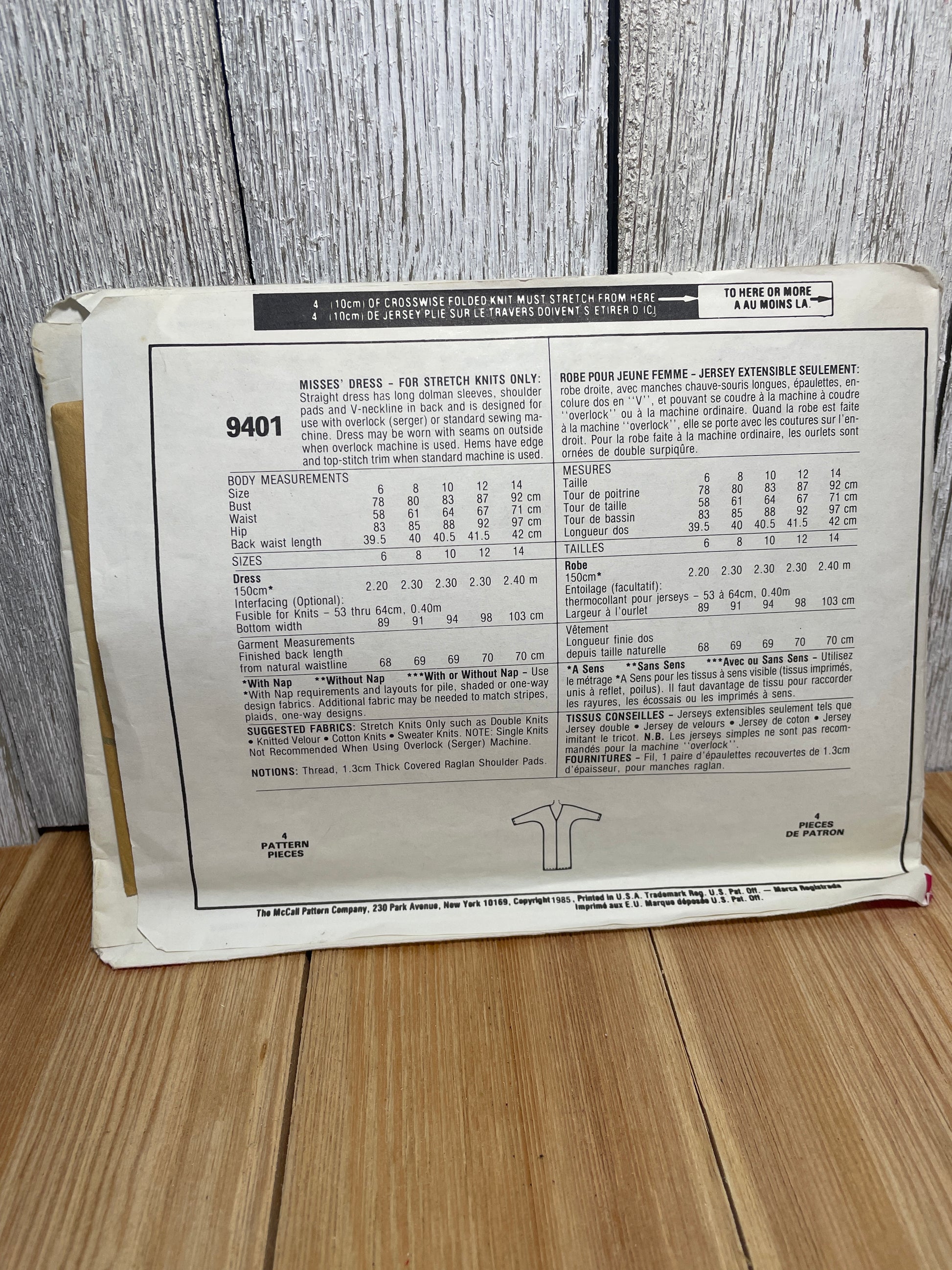 McCall's 9401 Misses Strech Knit Dress Deep V Line Back Size 10 Uncut FF Sewing Pattern