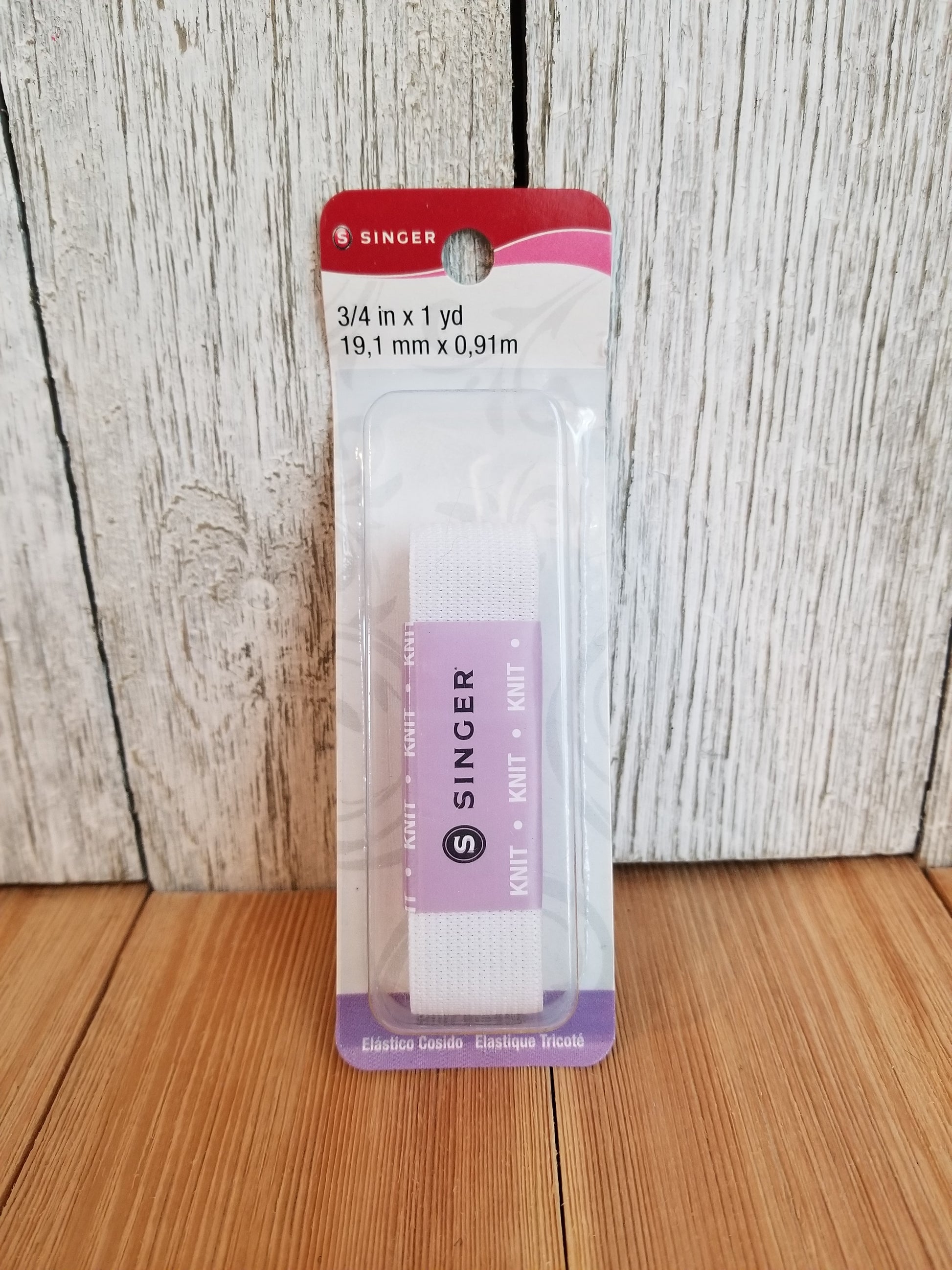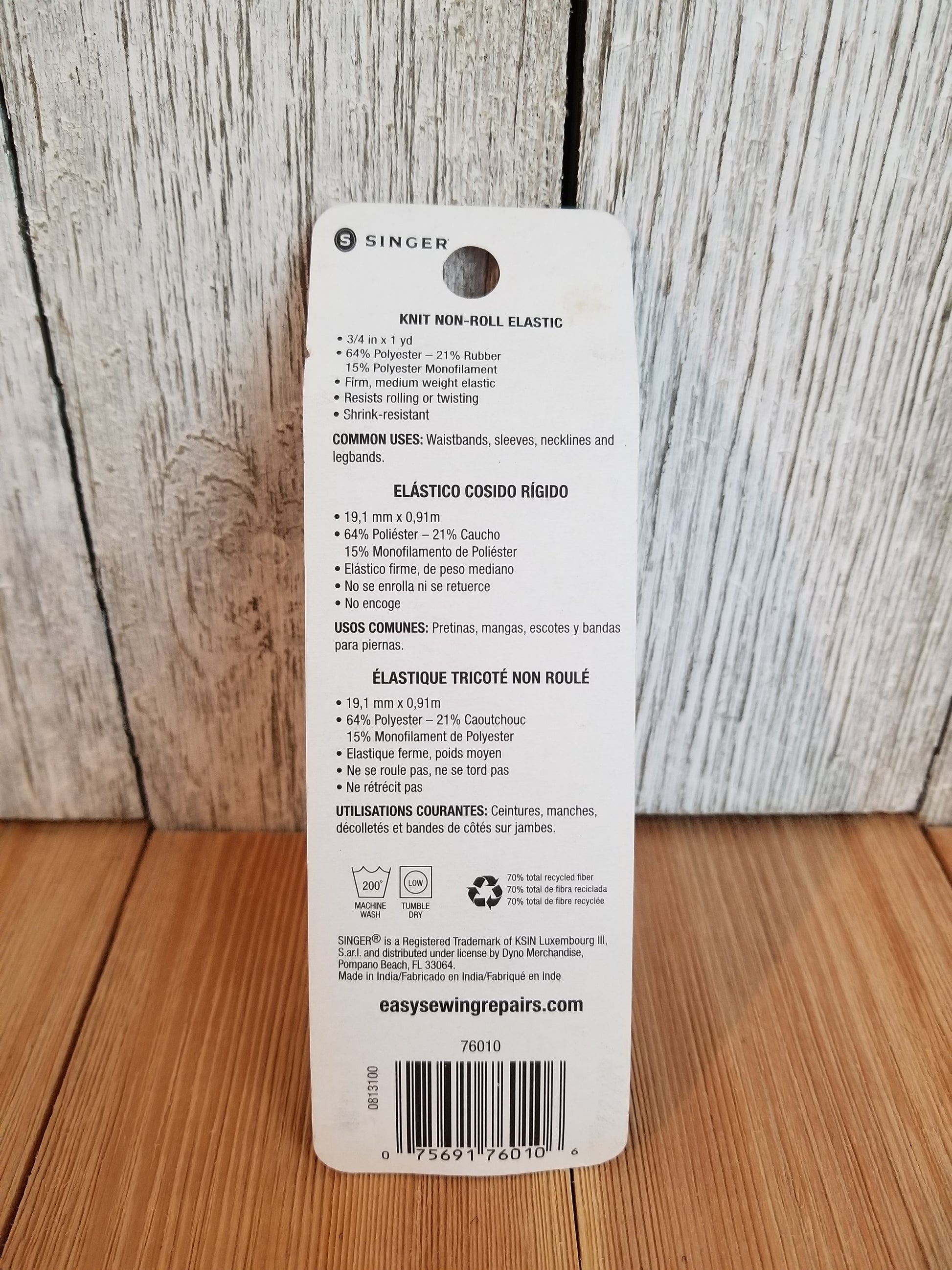 Singer 3/4" x 1 yard, white, knit non-roll elastic, resists twisting, shrink resistant