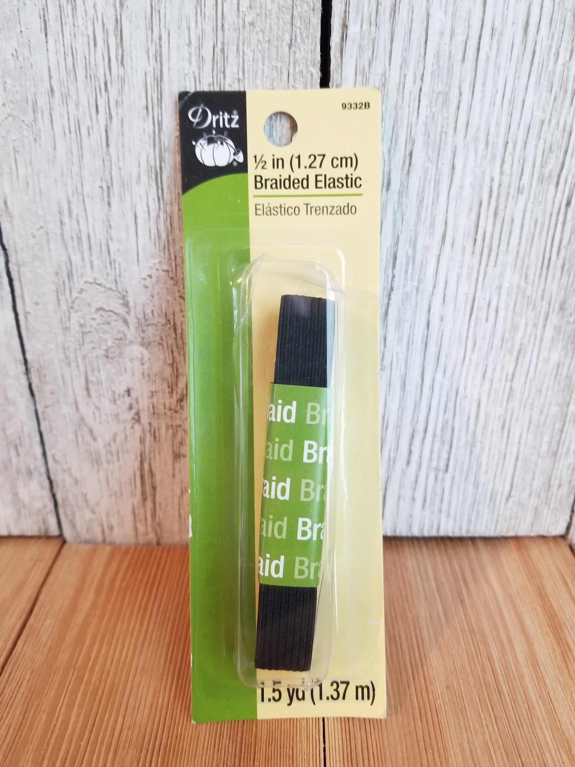 Dritz 1/2" x 1.5 yard black braided lightweight elastic that narrows when stretched