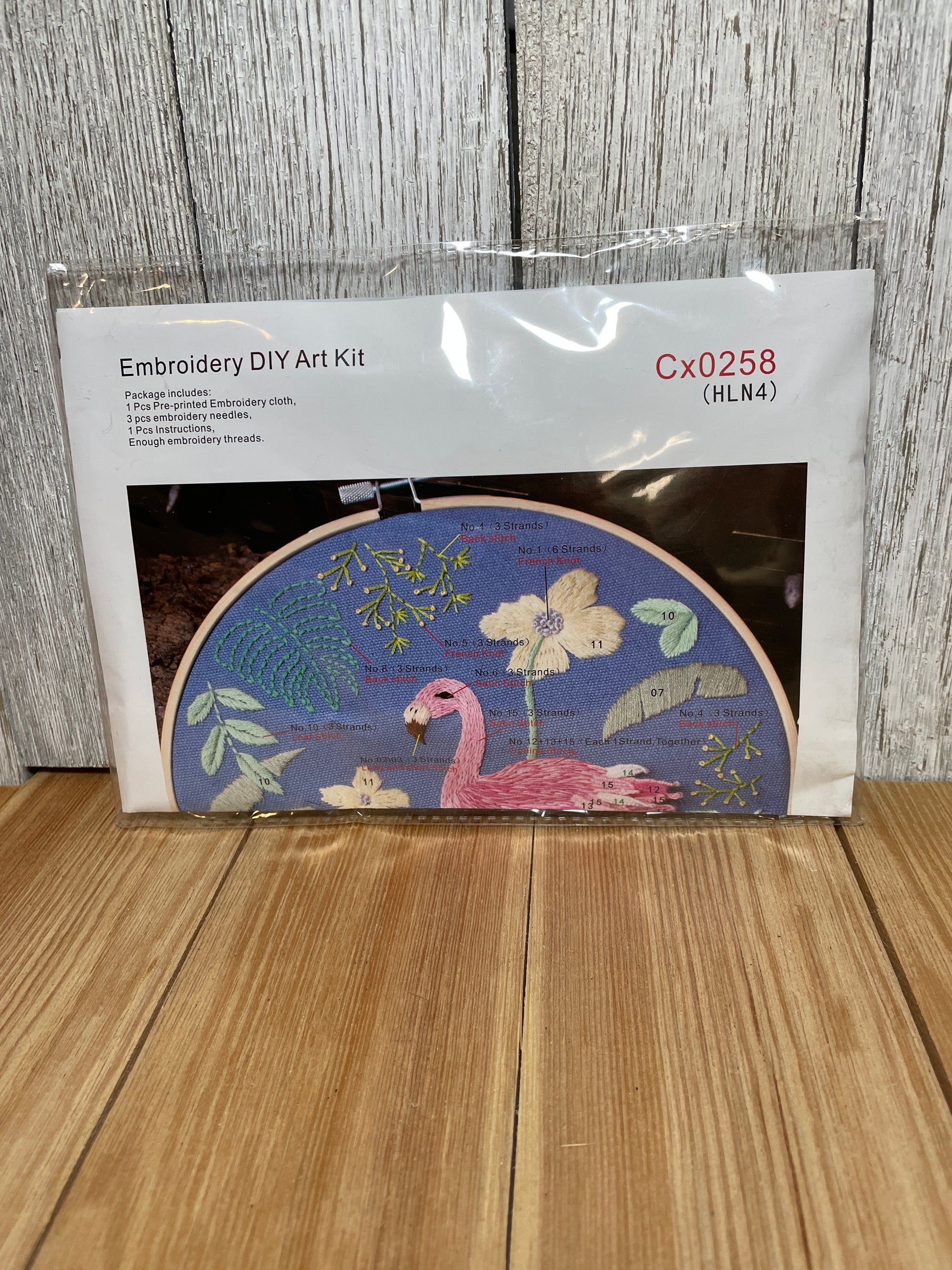 Embroidery Kit Pink Flamingo and Flowers On Blue Fabric