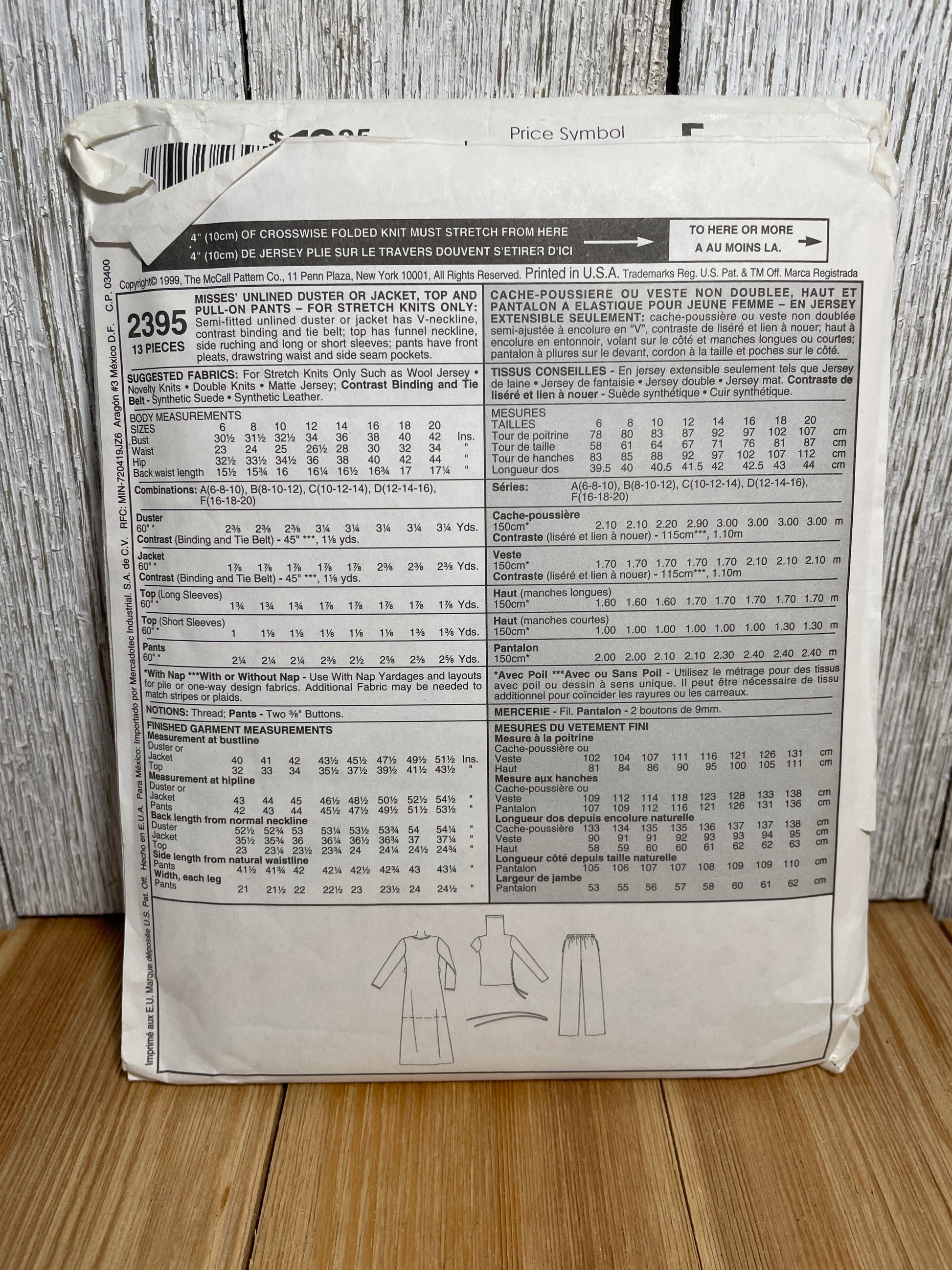 McCall's 2395 Jacket/ Duster Top Pull-on Pants for Knit Fabrics Size 10-14 Pattern Uncut FF