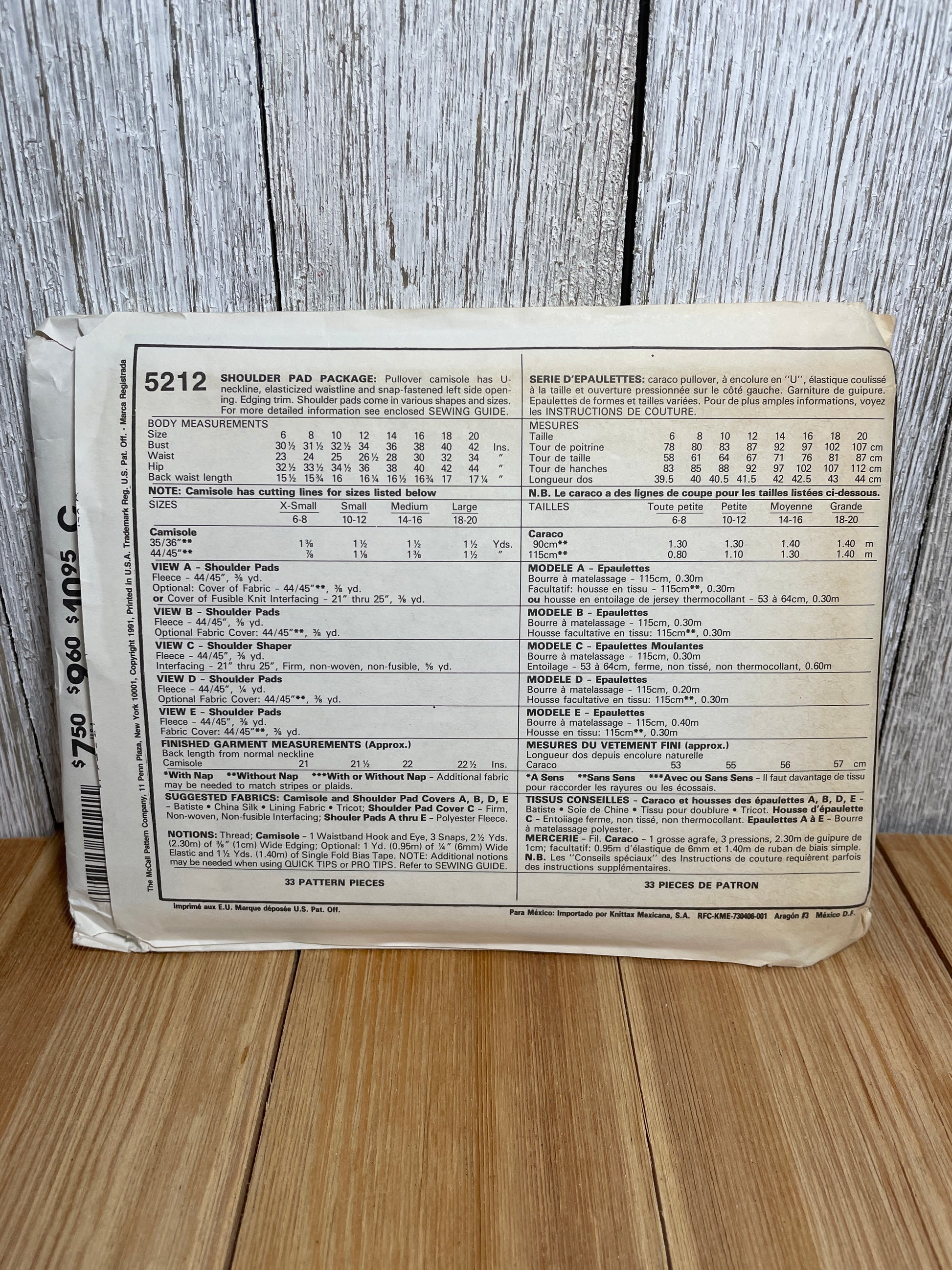 McCalls 5212 Shoulder Pad Package Plus Two Camisoles Size 6-20 Pattern Uncut FF