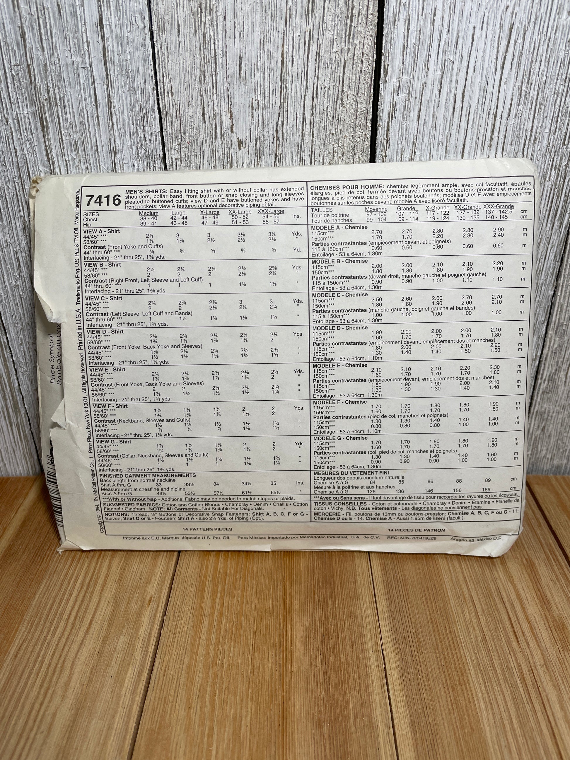 McCalls 7416 Cowboy Country Shirt Men's Size 46-48 Pattern Uncut FF McC Old West Brand