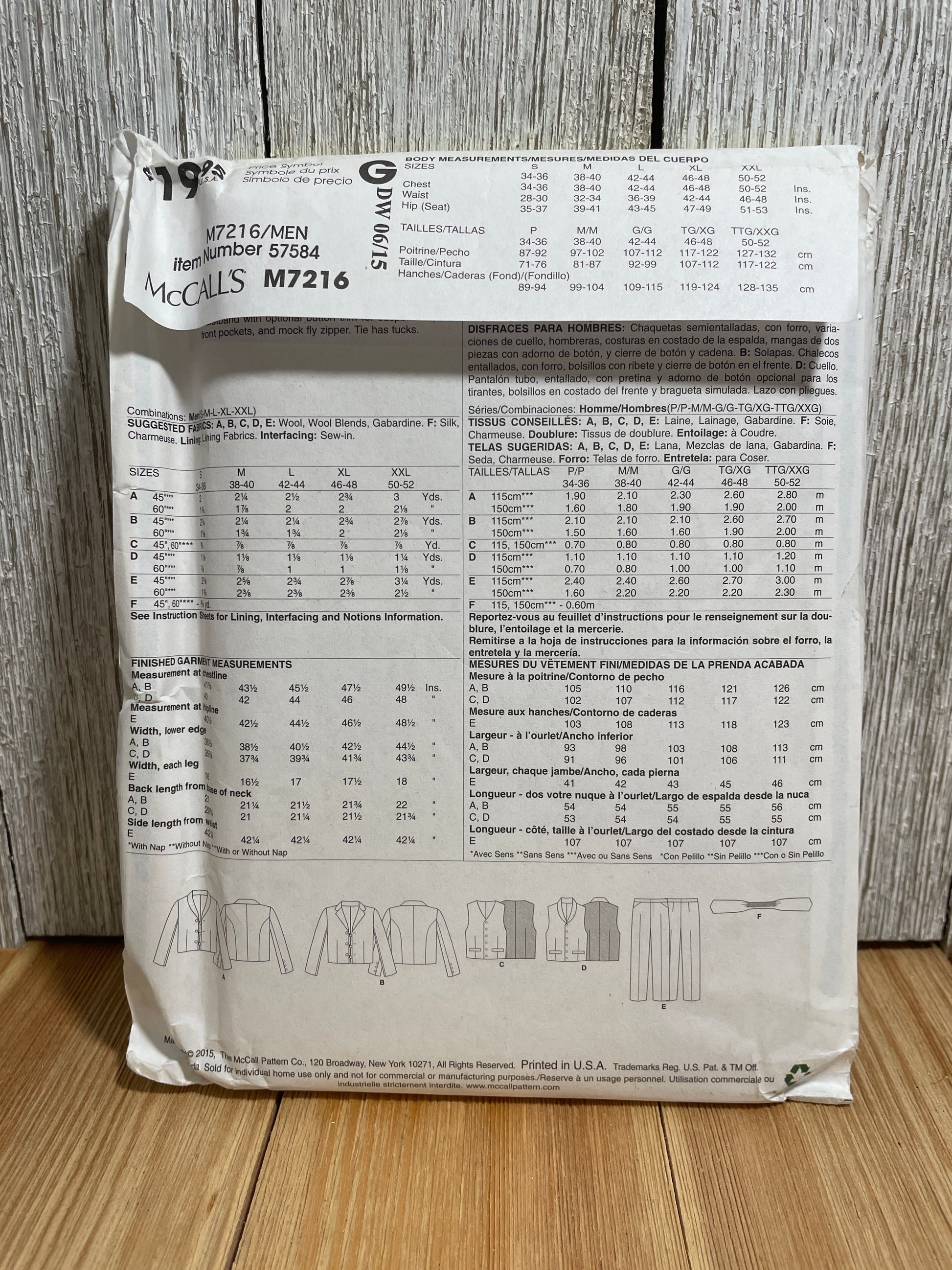 McCalls M7216 (7216) Men's Waistcoat, Jacket, Straight Pants Size 34-52 Pattern UNCUT FF Halloween Costume
