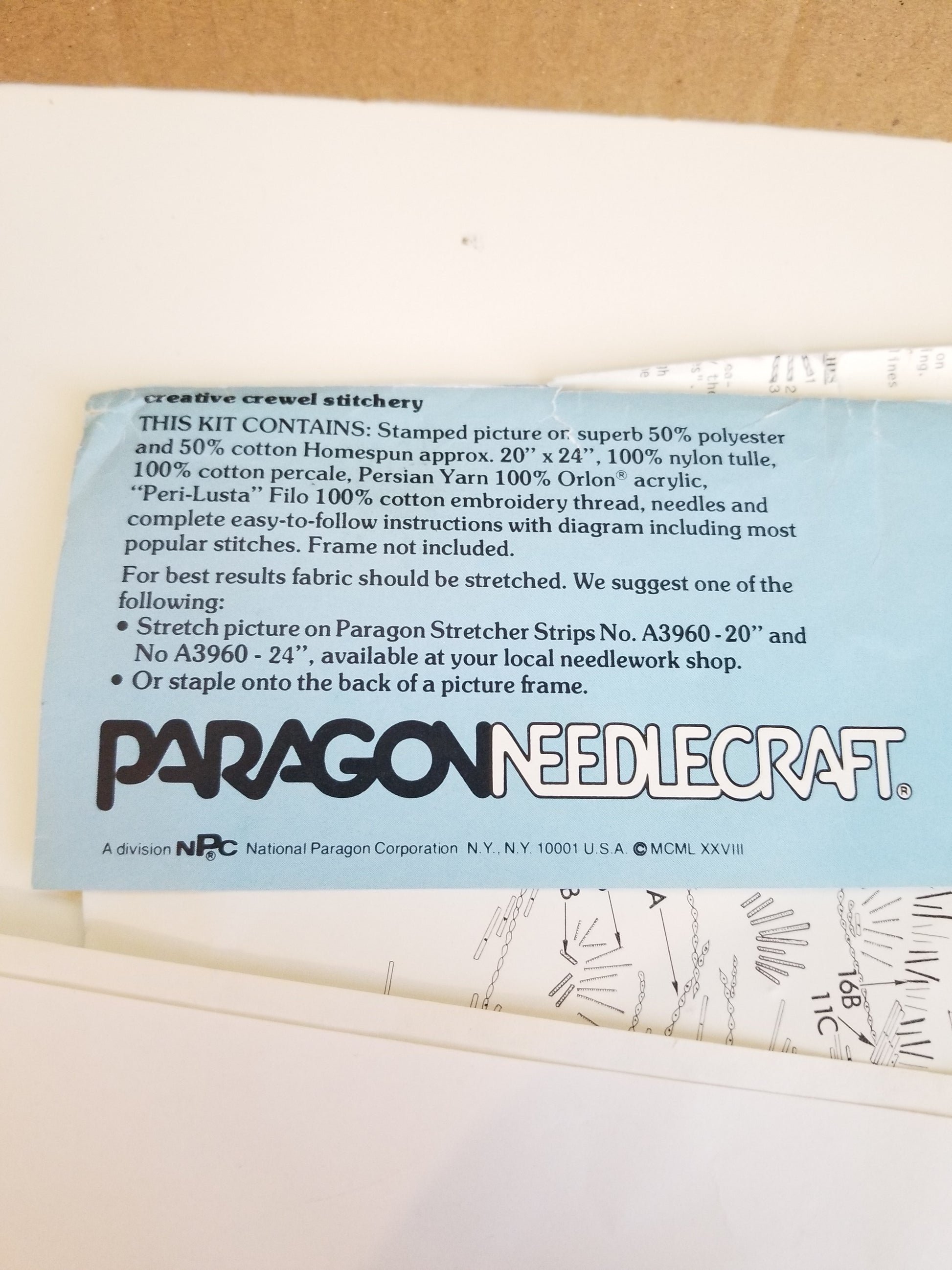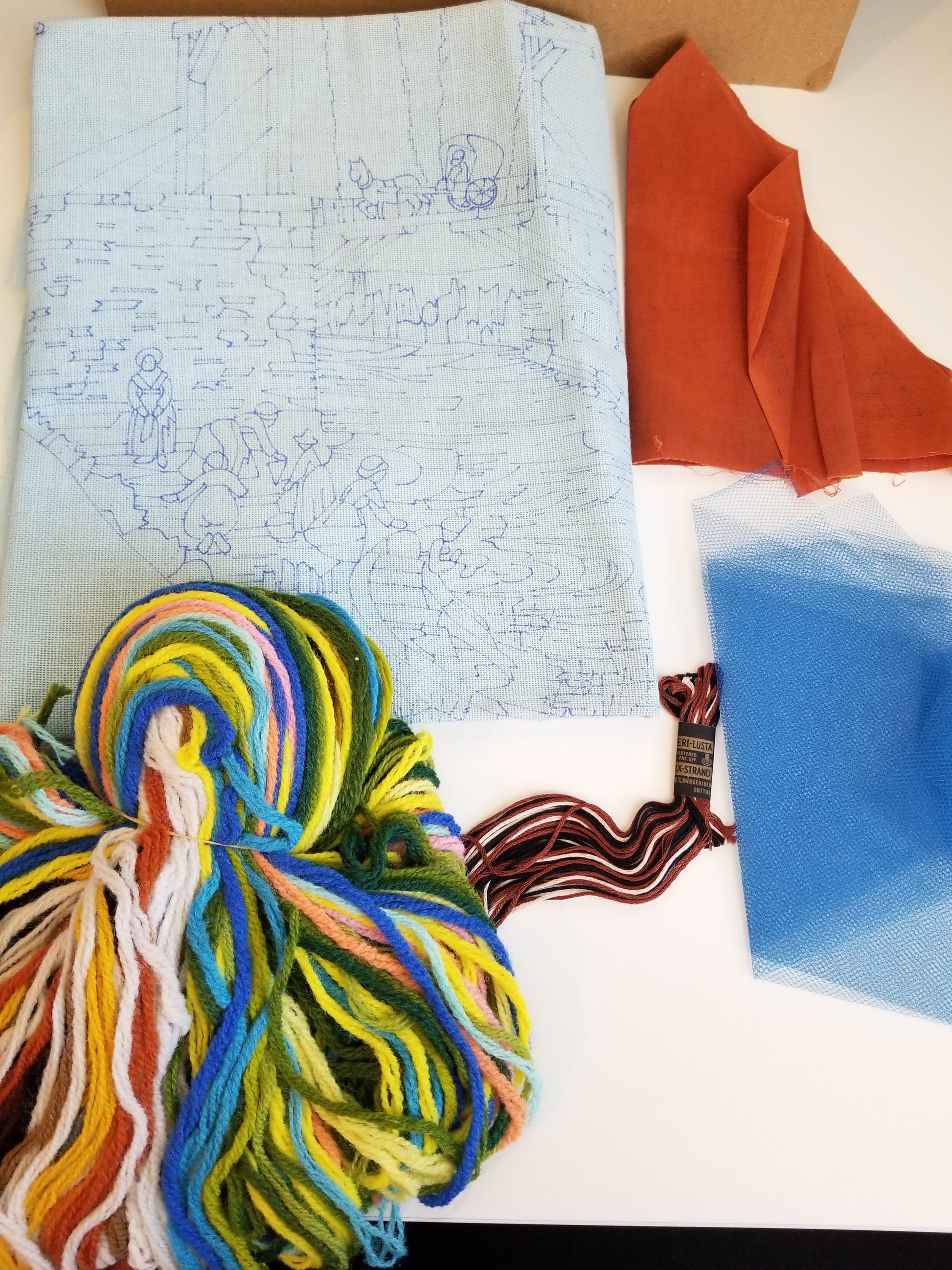 Includes printed blue main fabric, printed brown fabric, blue tulle, embroidery thread, acrylic yarn, instructions, needle