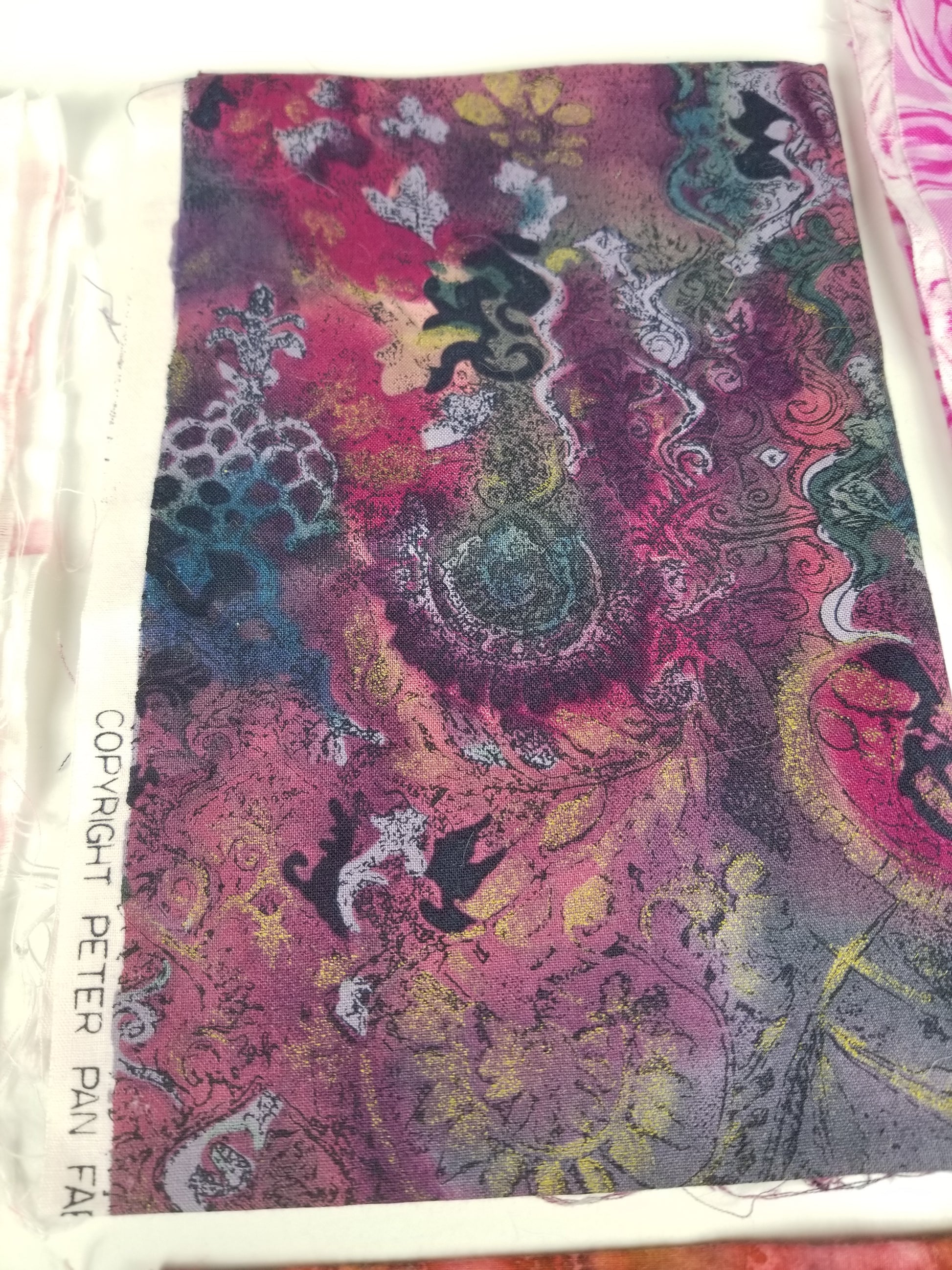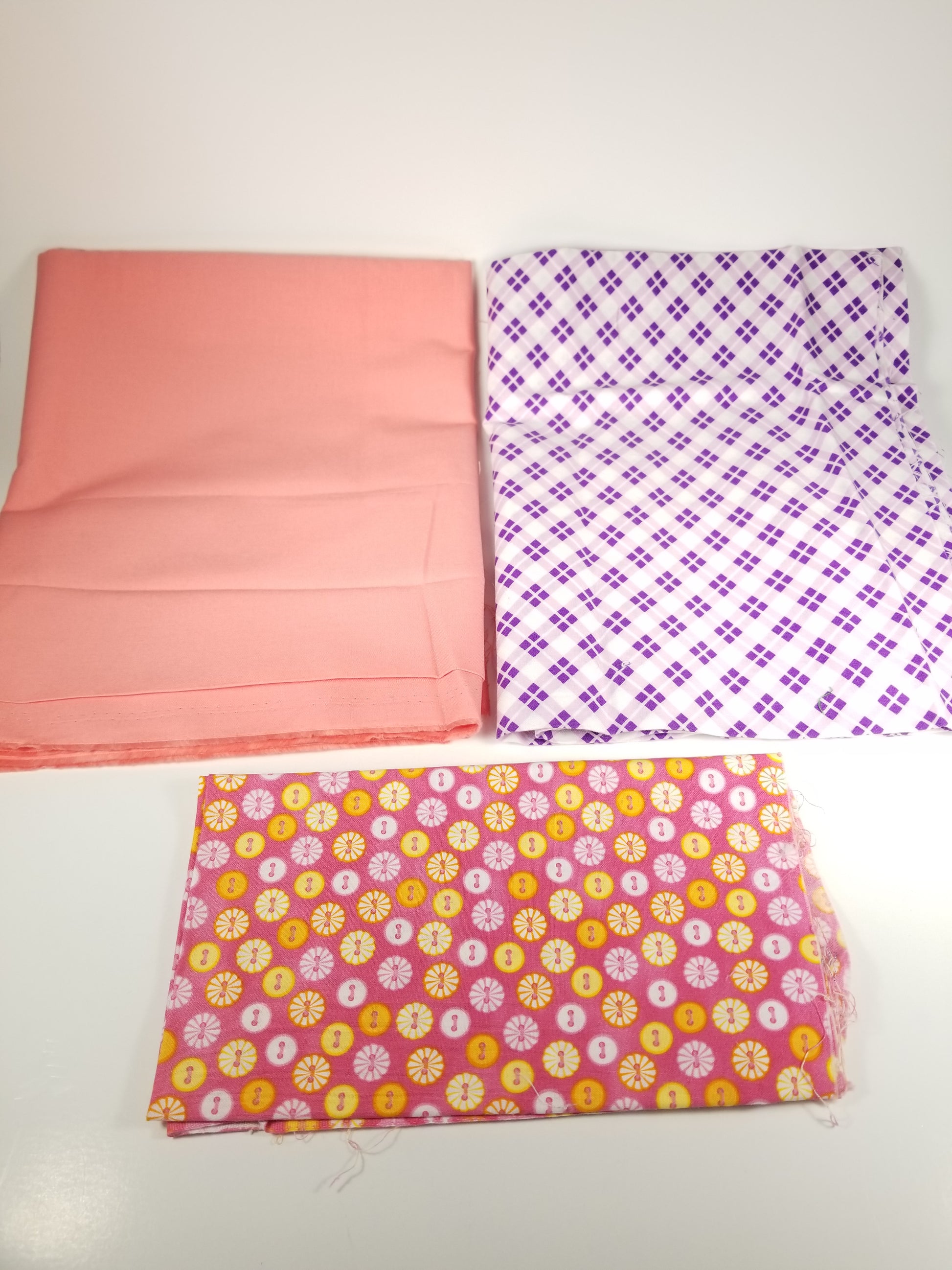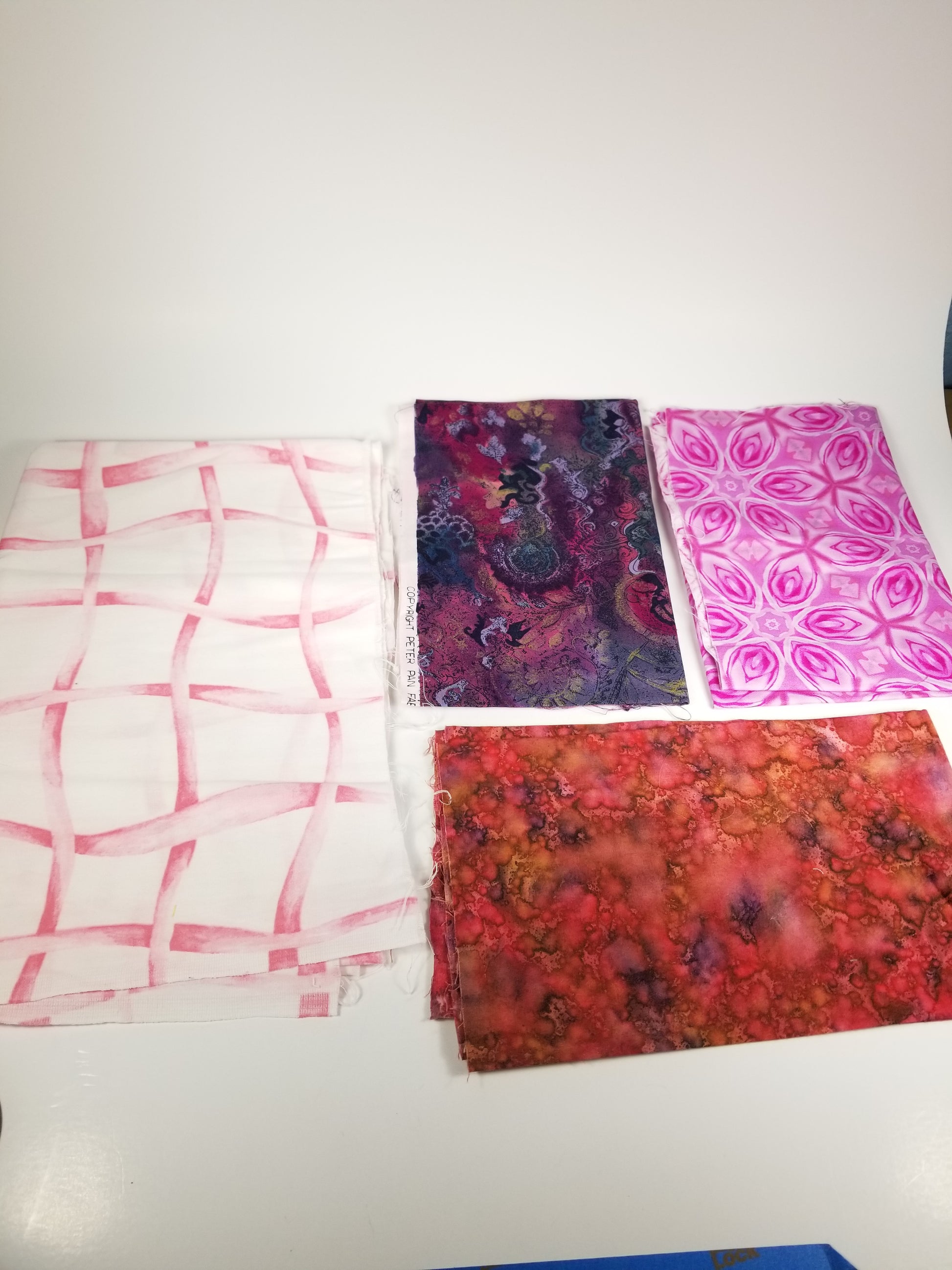 Solid pink, purple triangles, buttons, pink ribbion, pink flowers, pink red splotches, pink purple design