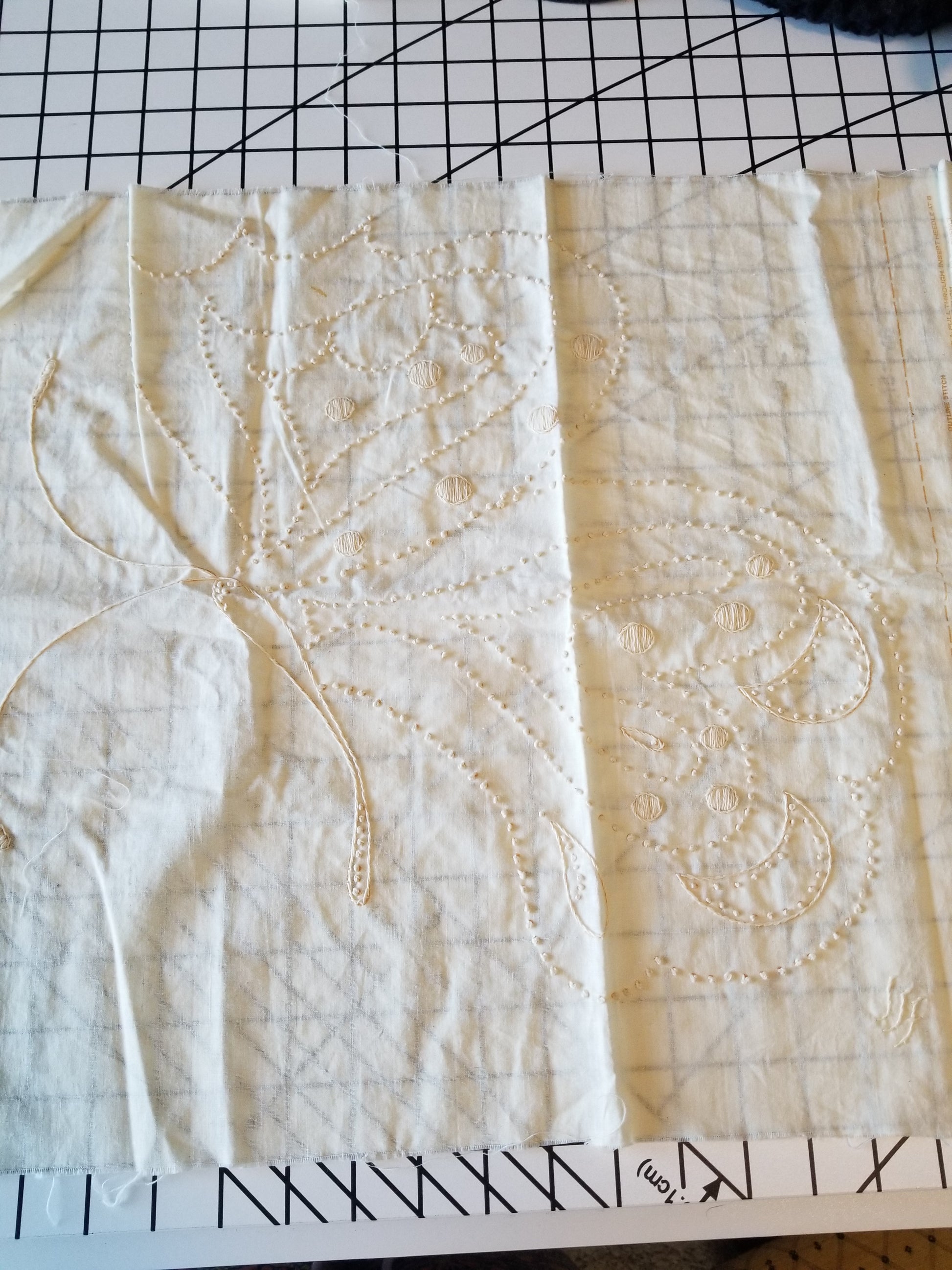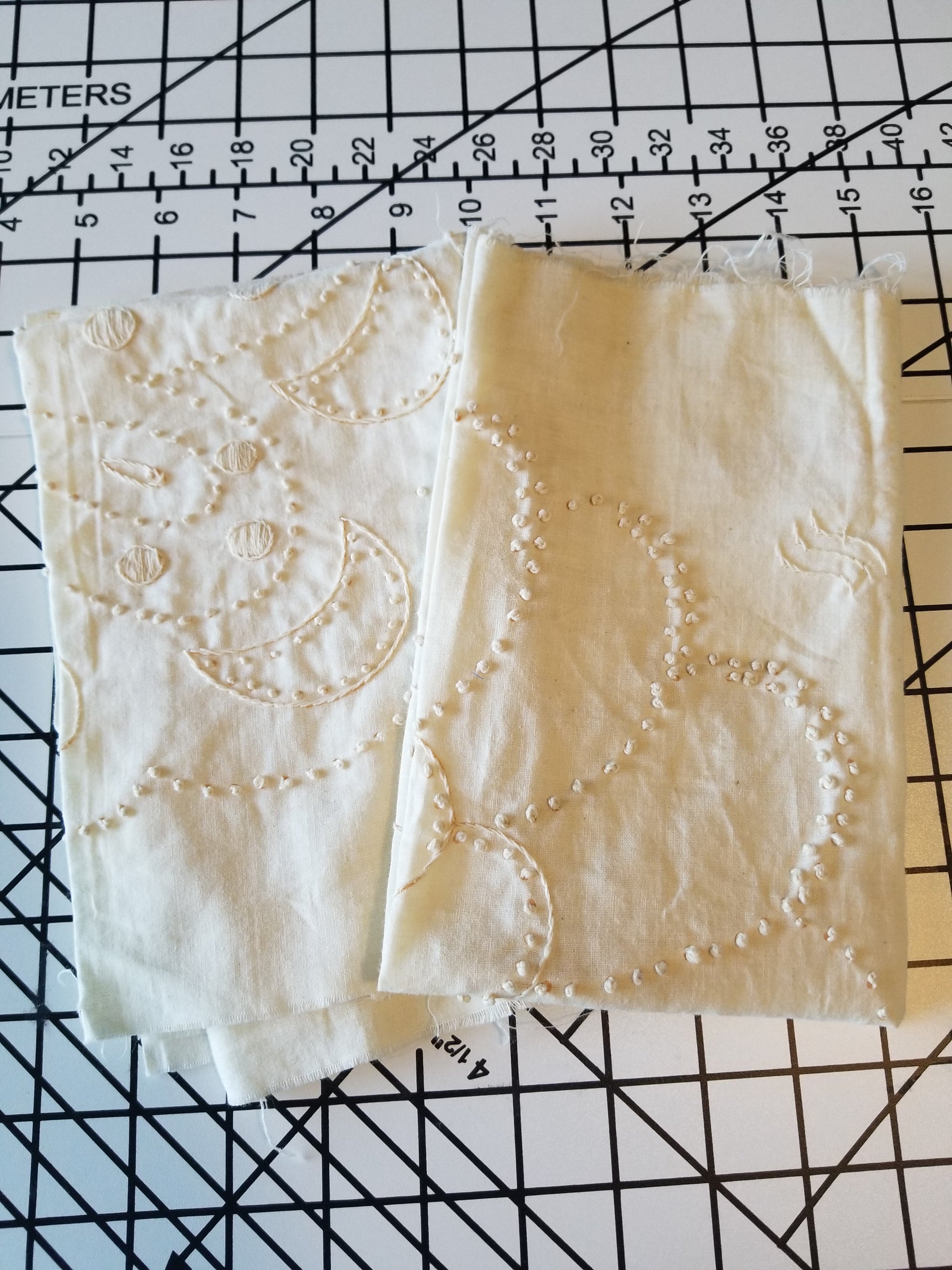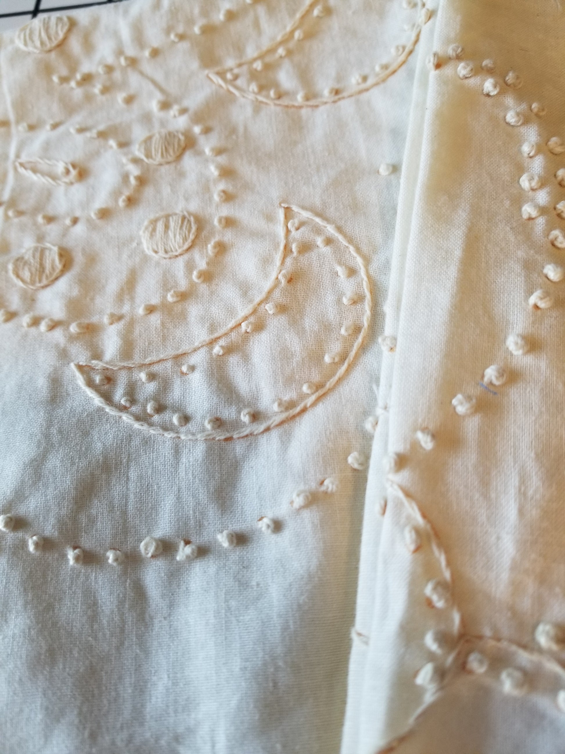 French knots and back stitch in cream on cream fabric. All embroidery is complete just needs to be finished into pillows or other. Perfect quick project for the holidays. Great wedding present. Beginner sewing project.