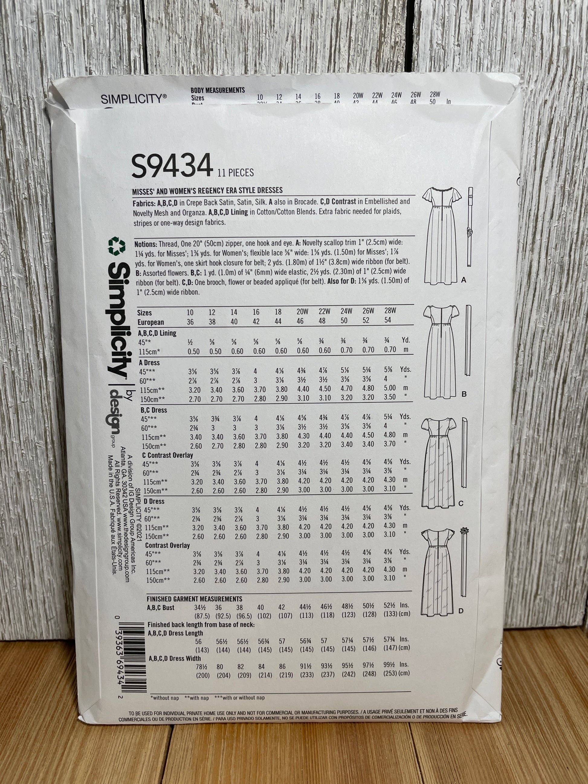 Simplicity S9434 (9434) Empire Waist Regency Dress Size 10-28W Pattern UNCUT FF Halloween Costume