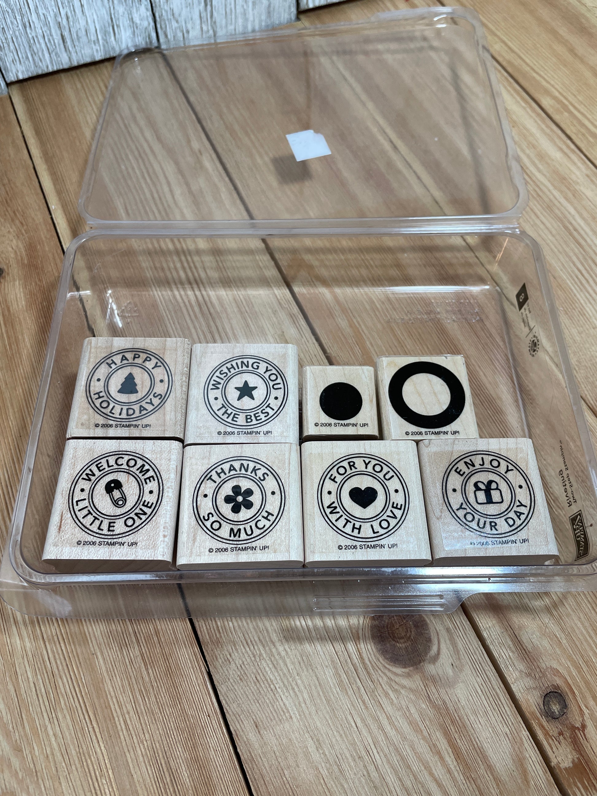 Happy holidays with tree, wishing you the best with star, Welcome little one with safety pin, Thanks so much with flower, for you with love with heart, Enjoy you day with present, Bullseye circle and dot.