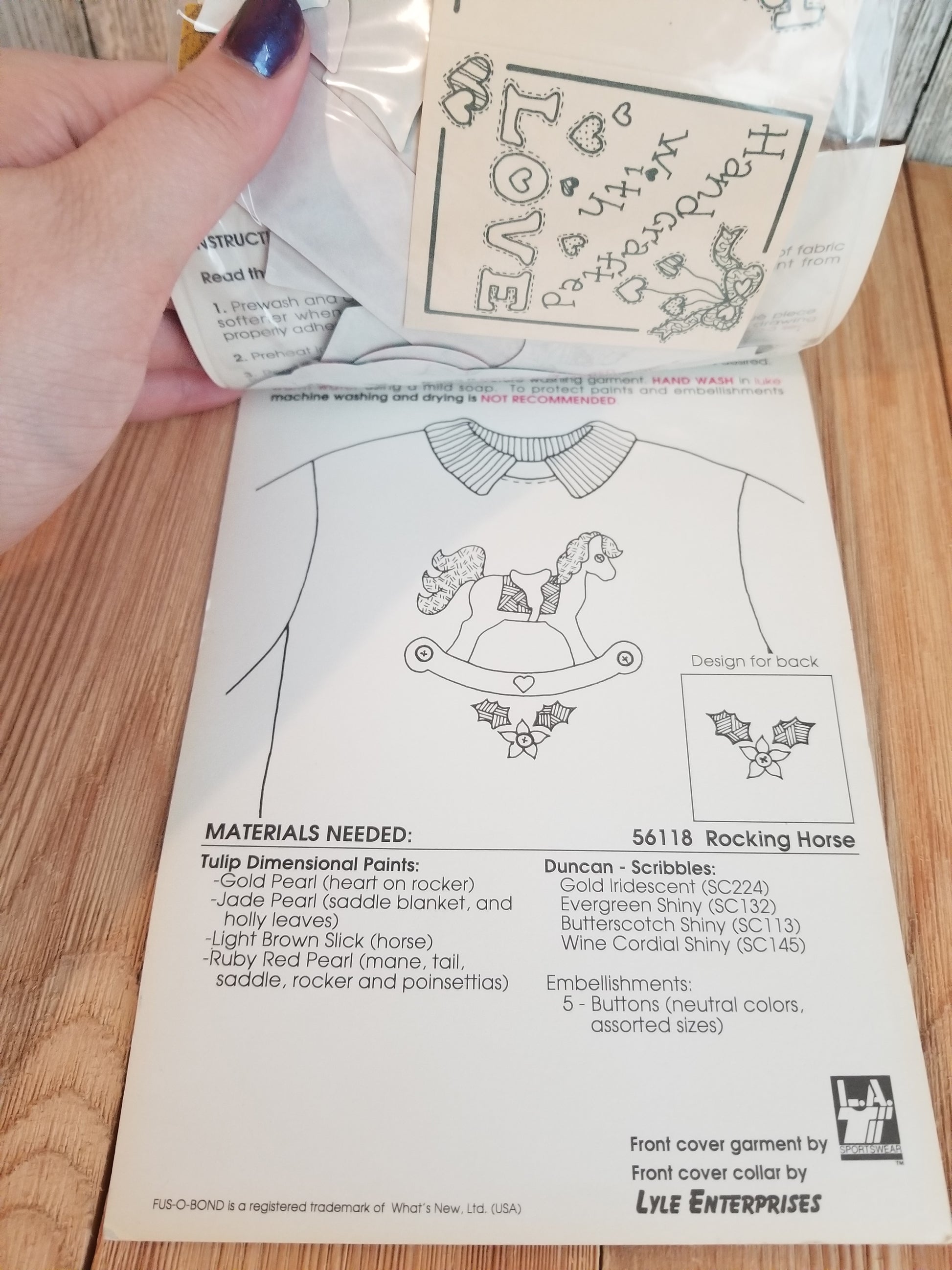 Kit includes die cut shapes with fus-o-bond (Adhesive) already applied to complete one rocking horse