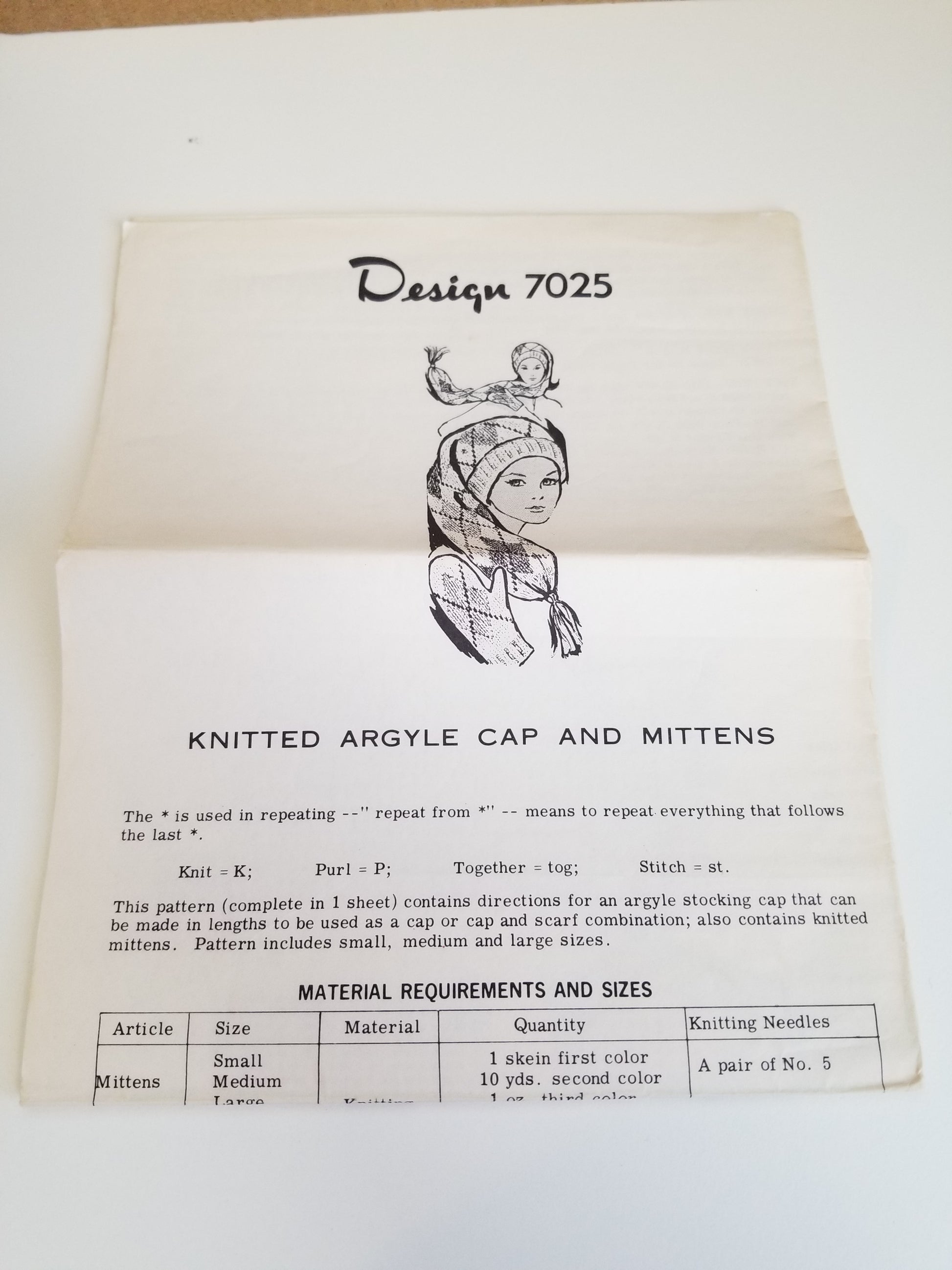 Design 7025 - Knitted Argyle Cap and Mittens (Mittens- sm-lg, short cap sm-lg, long cap sm-lg)