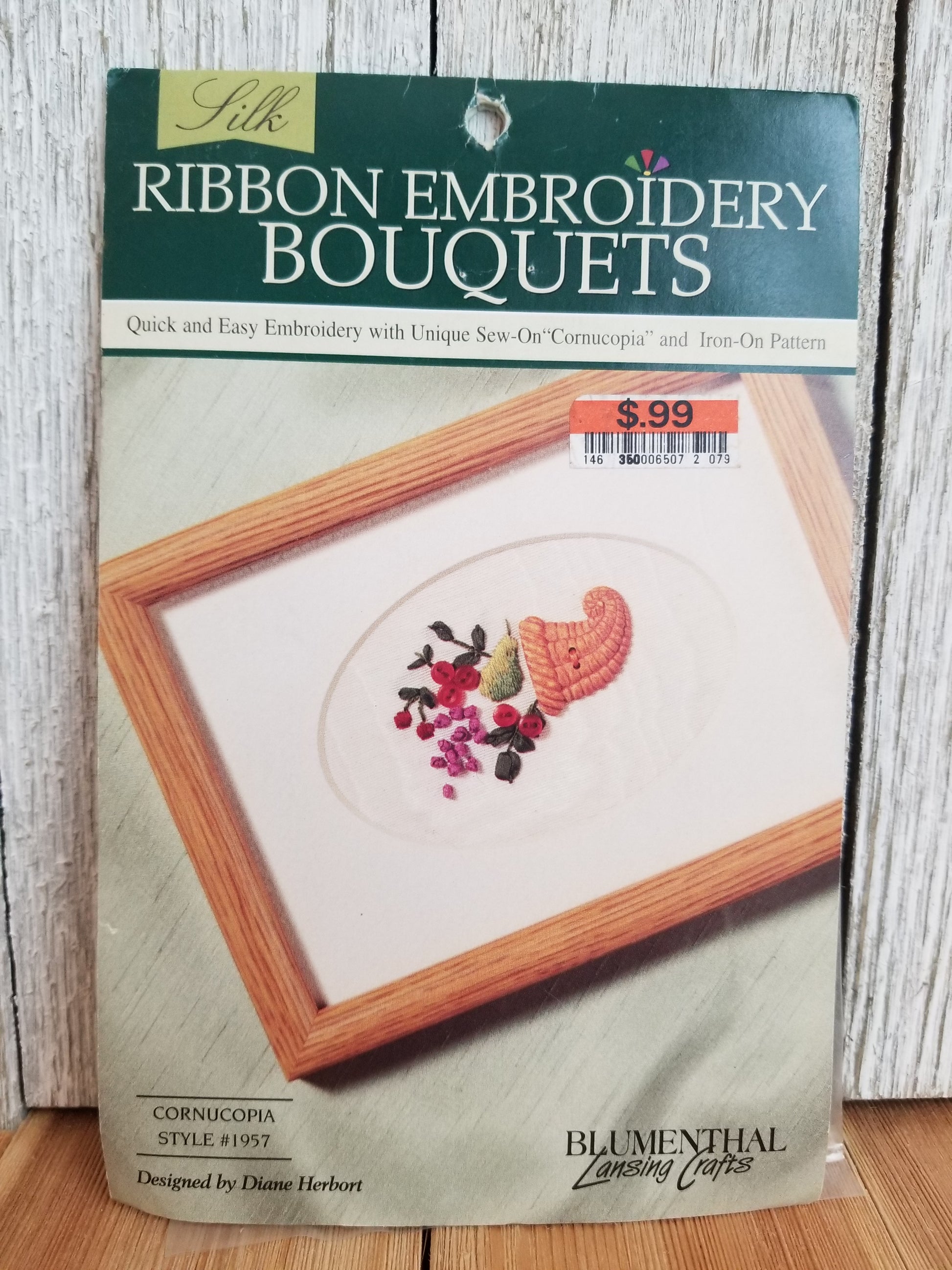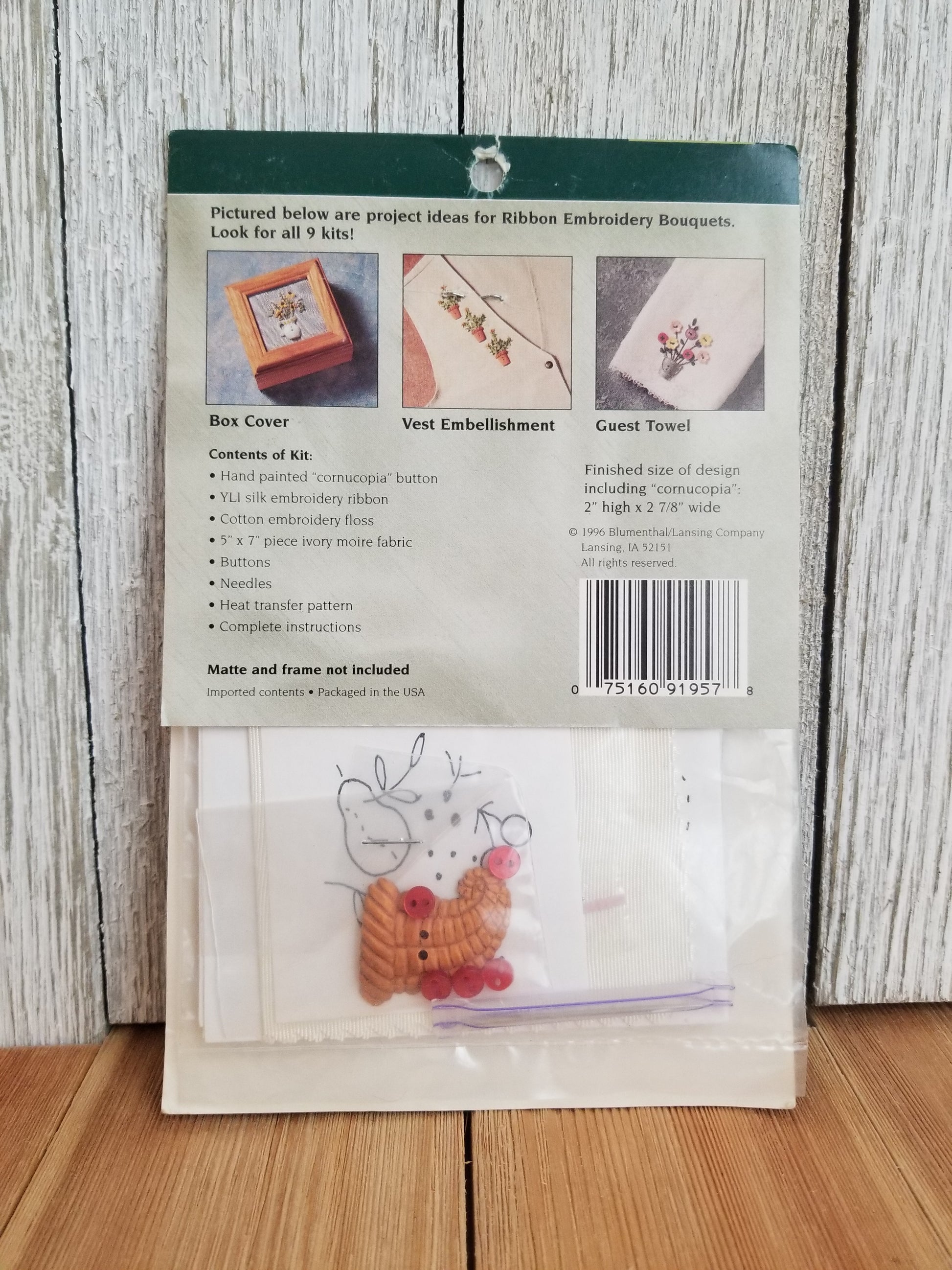Cornucopia #1957 (finished size is 2" x 2 7/8") Open but complete KitEach kit contains hand-painted button, silk ribbons, cotton floss, 5x7 ivory moire fabric, buttons, needles, heat transfer pattern and complete instructions.